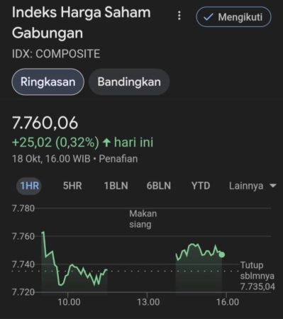 Index Sumut – Kinerja IHSG ditutup menguat 0.32% di level 7.760,060. IHSG pada sesi perdagangan hari ini bergerak sangat volatile.