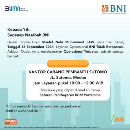 Libur Maulid Nabi Muhammad SAW, BNI Operasional Terbatas